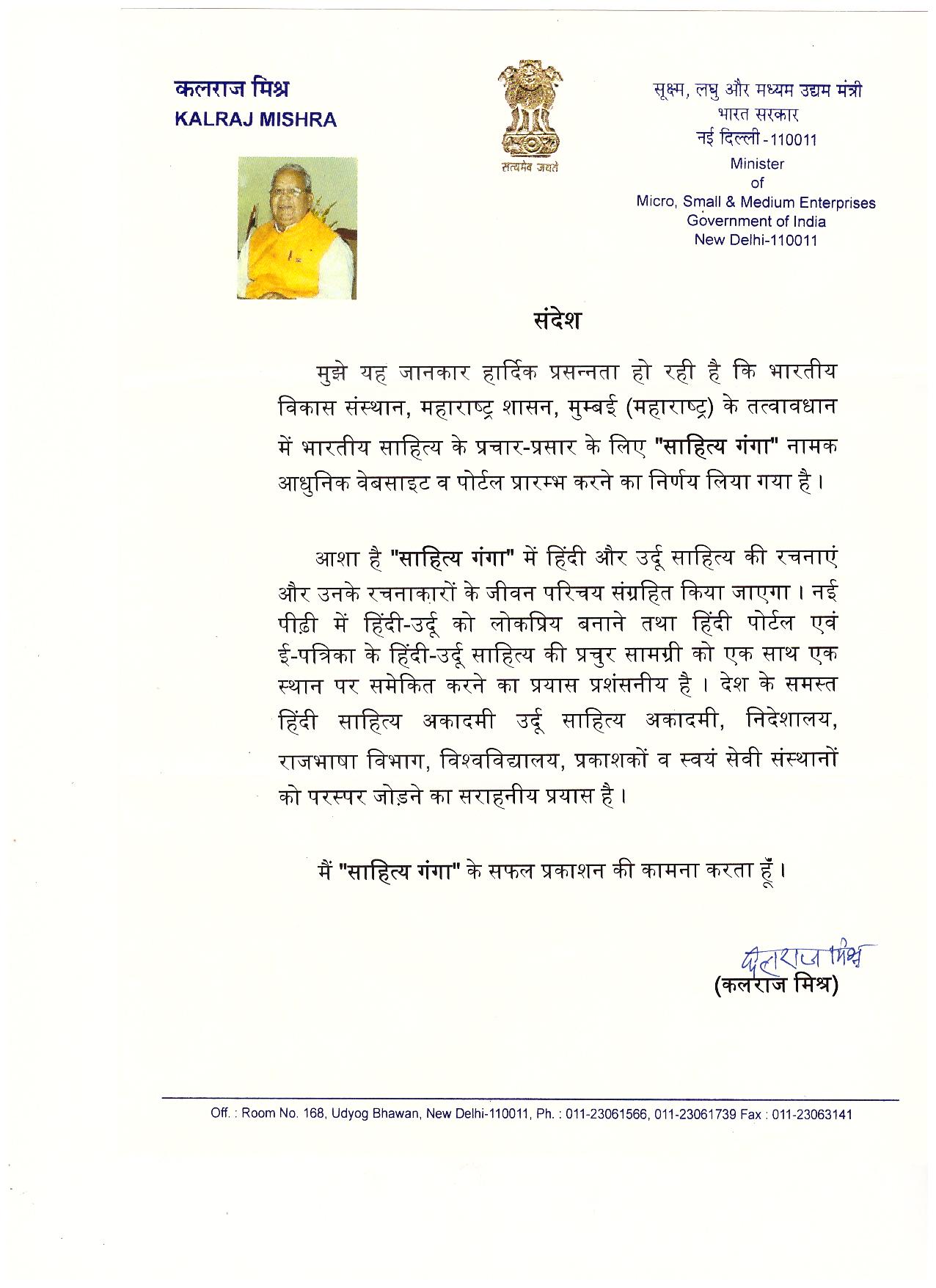 कलराज मिश्र की ओर से साहित्यागंगा को सन्देश: