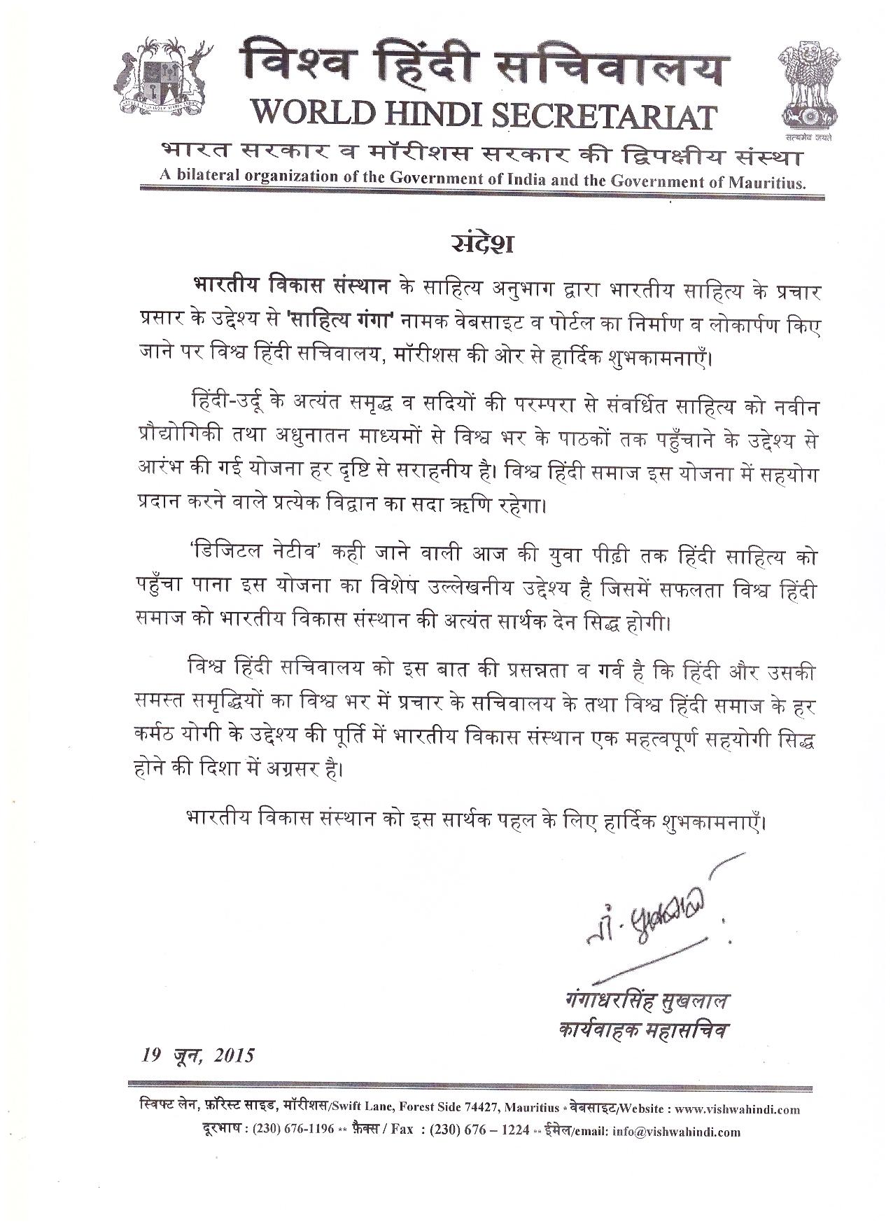 की ओर से साहित्यागंगा को सन्देश: